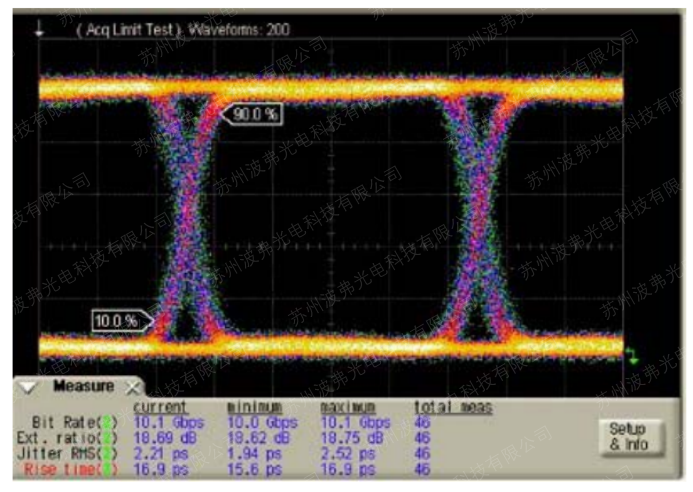 动态消光比的测量需要接入射频RF电信号在调制器的射频端口,并且DC偏压设置在所做应用的合适工作点上(通常Quad+,Quad-,Min,详见调制器的偏压控制文章)。所以,动态消光比是和最终应用相关的。例如数字调制方式(10Gb/s,通过MX-LN-10调制),如下图,通过PRBS产生射频电信号,偏压控制在Quad点上,通过高速示波器,我们测量的眼图最高和最低水平的比值-动态消光比是18.6dB(见示波器测量数值Ext. Ratio)。